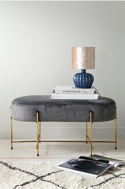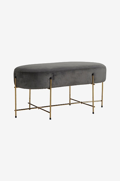 Bänk med stomme av metall och klädsel av stoppad sammet. Fyllning av polyeter.