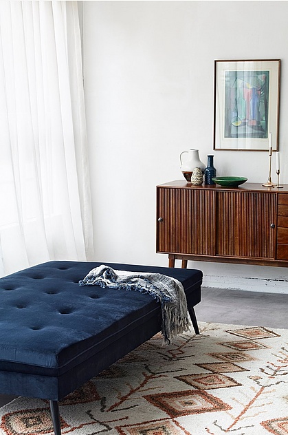 Dagbädd med trästomme, nozagfjäder och fjädrande gummiband. Klädsel av polyester och fyllning av polyeter. Ben av furu med ett extra stödben i mitten.