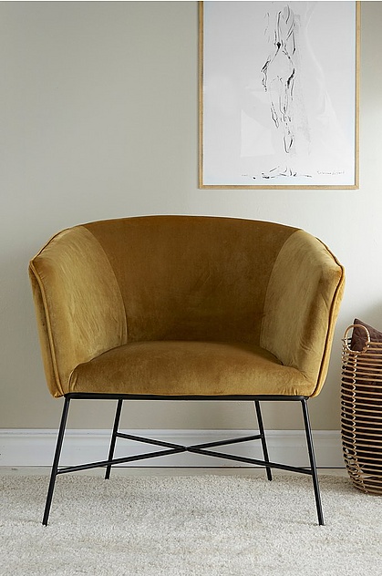 Bekväm, lättplacerad fåtölj i modern design. Ben av metall, klädsel av sammetstyg och fyllning av polyeter.