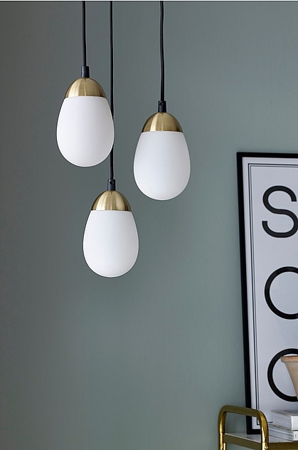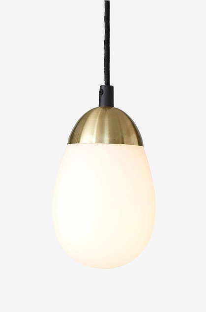 Fönsterlampa med kupa i matt vitt glas och ovandel i mässingsfärgad metall.