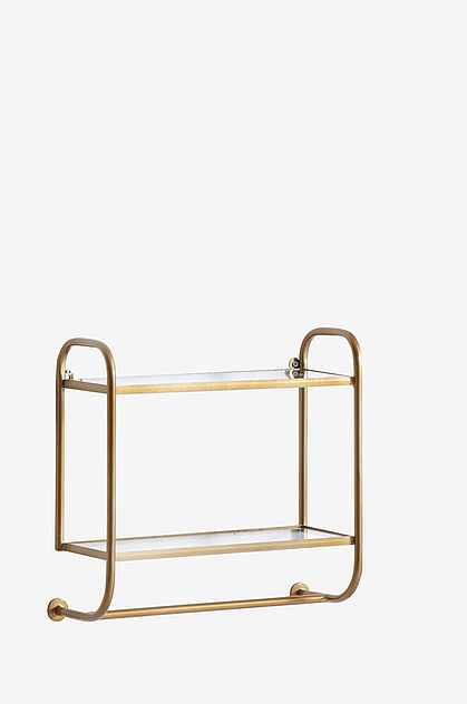 Hylla som fästs på väggen. Passar lika bra i hallen som i köket eller badrummet. Av mässingsfärgad metall. Två hyllplan av glas och en stång undertill för handdukar (krok ingår ej), halsdukar skärp etc.