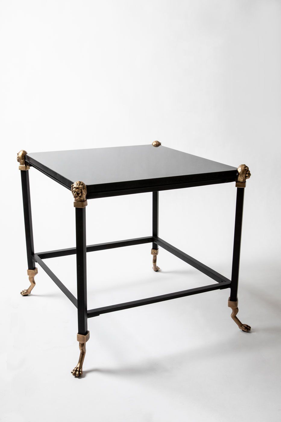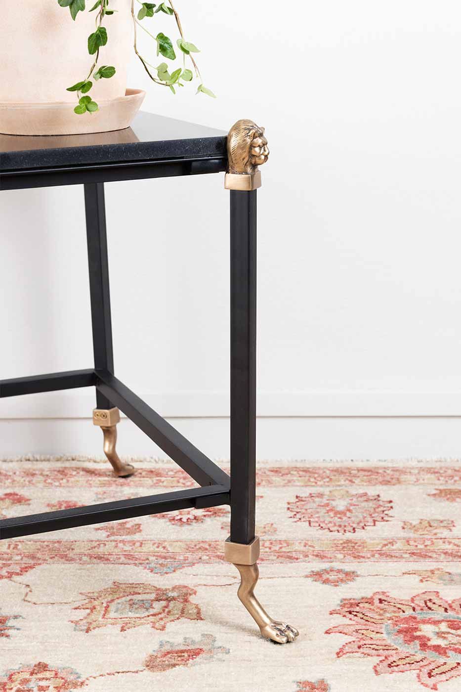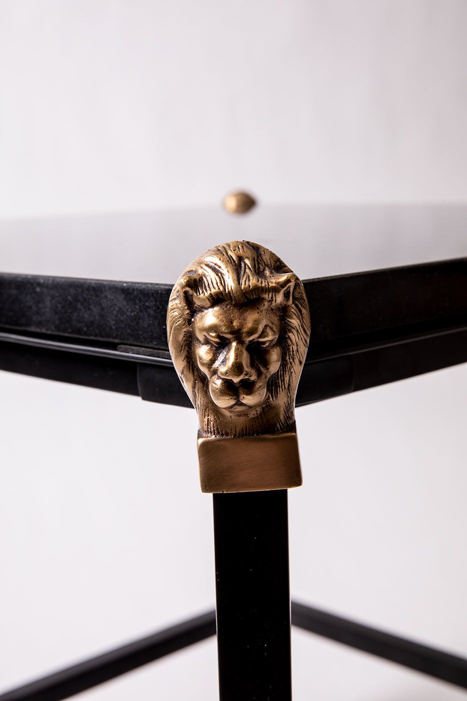 Ett elegant svart sidobord där bordshörnen är dekorerade med guldiga lejonhuvuden.
