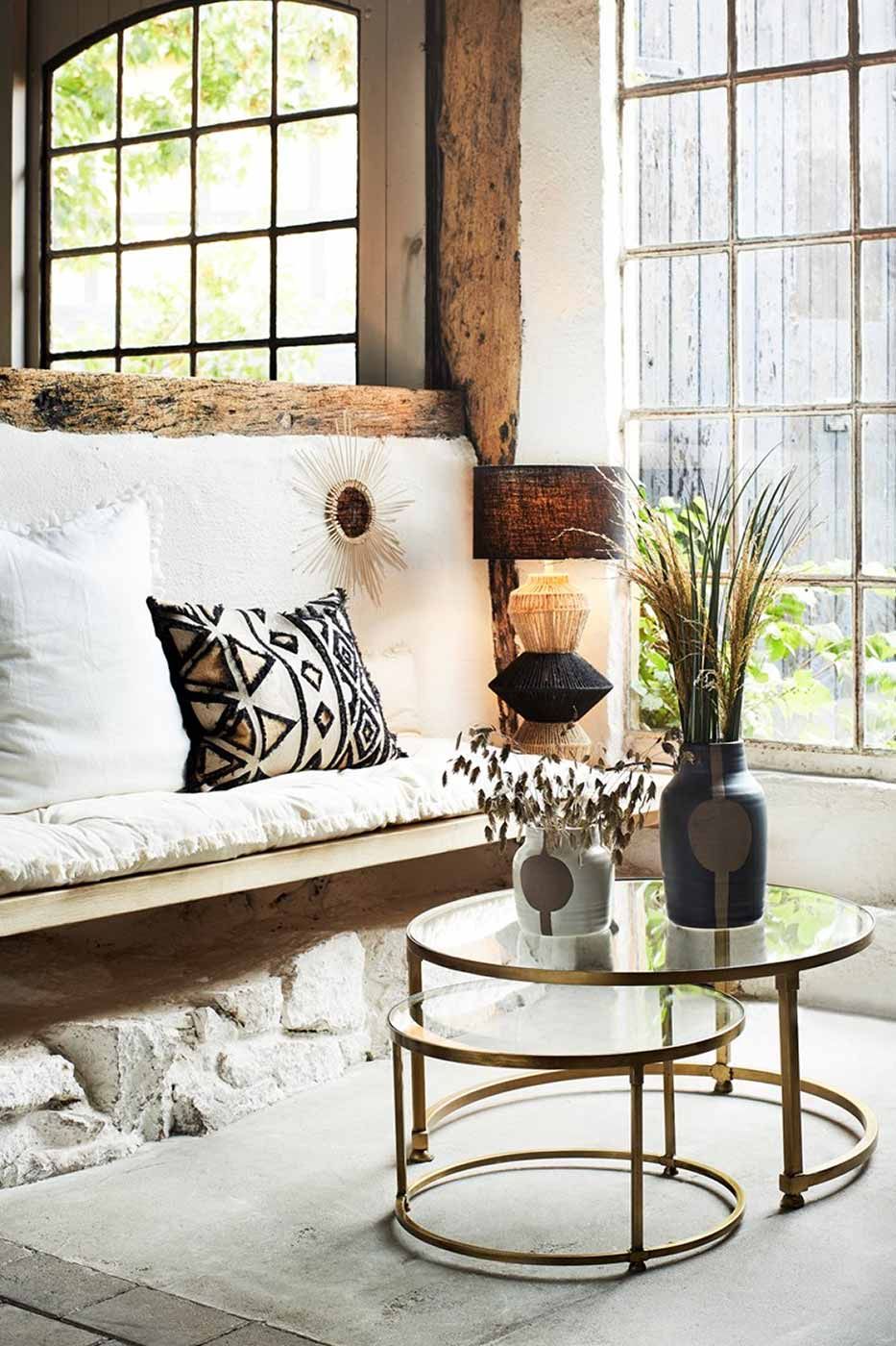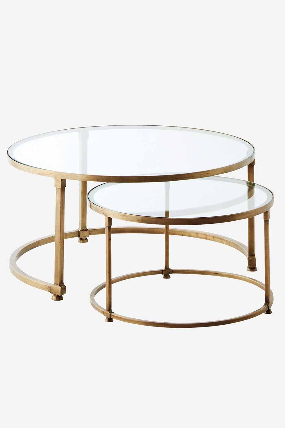 Ett stilfullt och elegant soffbord med reflekterande glasskivor inramade i mässing.