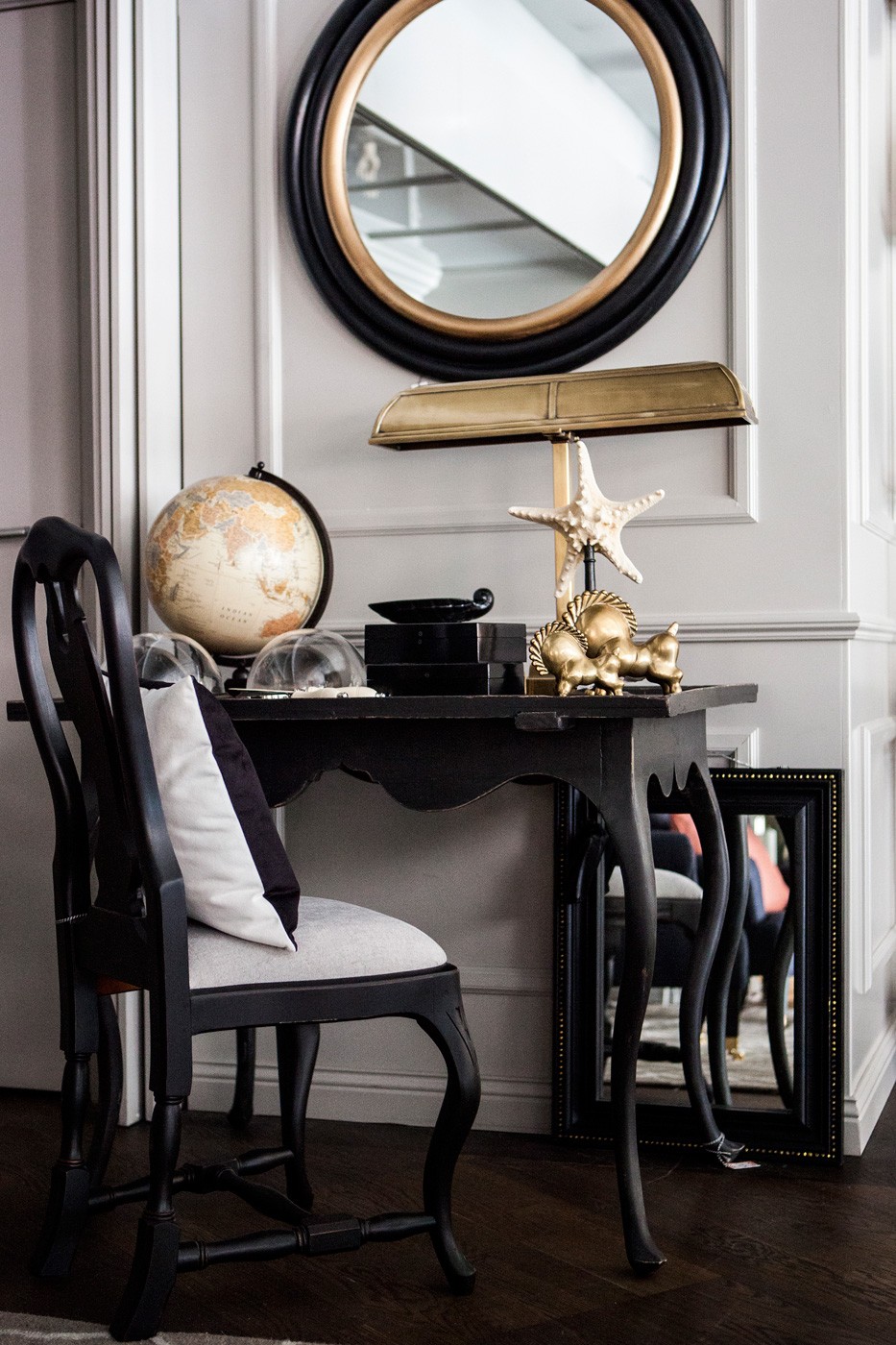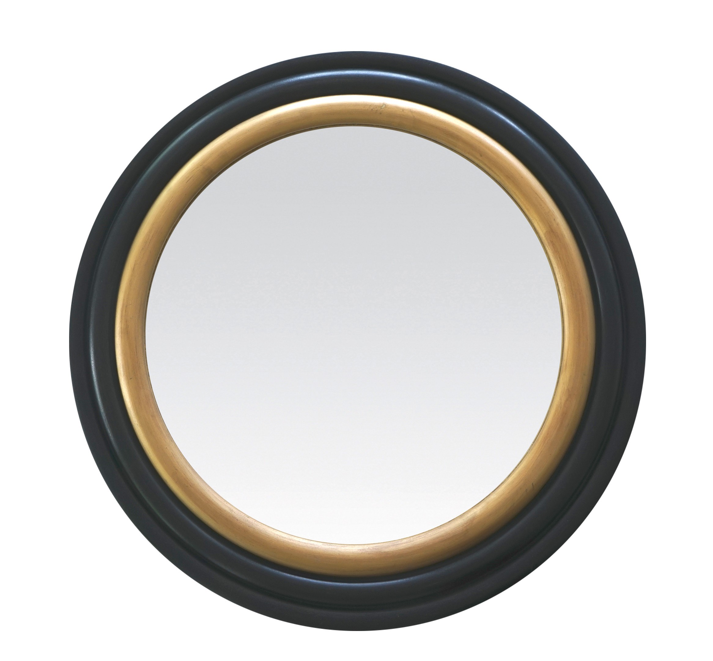 Snygg, rund spegel med svart- och guldfärgad träram. Dess eleganta ram gör detta till en mycket snygg dekoration och inredningsdetalj.