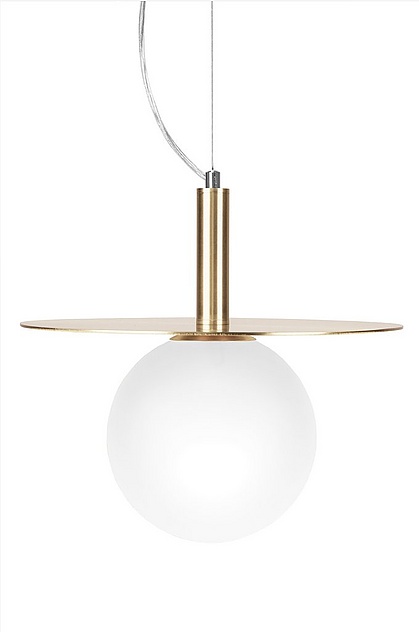 Taklampa Art Deco med tydliga influenser från art decon med sina geometriska former. Borstad Mässing kontrasterar mot vitt frostat glas och ger en vacker och effektfull lampa. Transparent sladd med takkopp i borstad mässing.