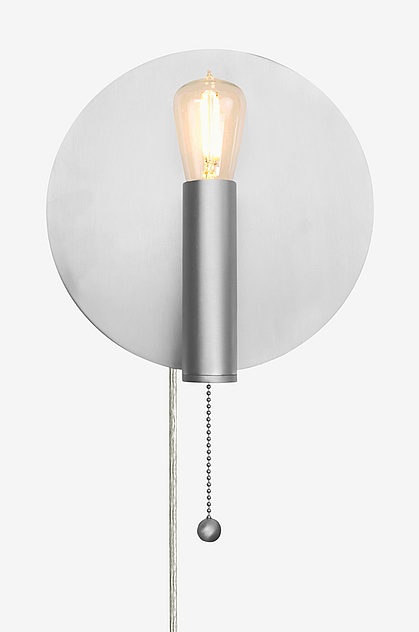 Vägglampa designad med den gamla kungalampetten som ursprung. Rund form i borstad stål med friliggande ljushållare. Dragströmbrytare i matchande färg och transparent kabel.