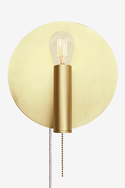 Vägglampa Art Deco designad med den gamla kungalampetten som ursprung. Rund form i borstad mässing med friliggande ljushållare. Dragströmbrytare i matchande färg och transparent kabel.